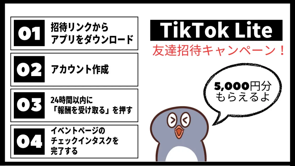 今だけ期間限定で、TikTok Lite(ティックトックライト)にこちらの招待リンクから登録すると5,000円分のポイントをゲットできるキャンペーンを実施しています。(18歳以下不可)